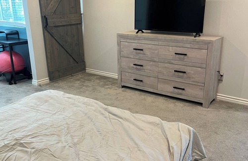 Master bath features double sink and custom walk in spa shower with multiple heads and bluetooth speakers. Second bathroom features Japanese soaking tub. Master BR features a Cal King bed and a bonus room with closing barn doors, which can be used a sitting room, office or gym. Second bedroom features a full size bed and futon. Third bedroom features a trundle bed with 2 twin mattresses. Living room features a designer sectional, 65 in UHD TV with Klipsch sound system and LED fireplace. Designer kitchen contains Bosch appliances and comes fully stocked. Separate dining room with glass dining set. Additional office nook off of the living room with custom made oak standing/sitting desk and storage credenza. Deck features outdoor sofa and custom made bar with hanging television. Hall closet with new stacked washer/drying and custom built shelving.