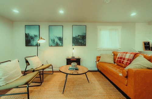 Inside, you'll find a thoughtfully designed, modern cabin where you can gather in the comfortable living room by the electric fireplace. The kitchen is fully equipped with everything you need to prepare meals, including stainless steel appliances and granite countertops, or grill up some burgers for dinner. The propane fire pit keeps conversational central to the back deck where the evening can unwind without straying far from the convenience of the home.