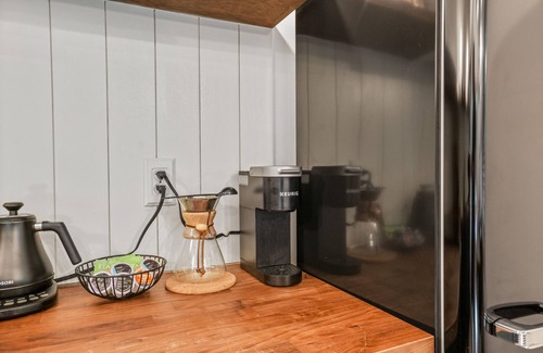 XO Bungalow has a bedroom with a king bed and room darkening blinds, full bathroom with shower, and an open concept living room, dining room and kitchen space. Large windows in the living room and bedroom look out onto a private deck, hot tub, fire pit, and of course, the tranquil woods of Wilder. A 3 seater sofa pulls out into a queen bed in the living room to accommodate 2 more guests.
