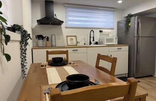Welcome to your private retreat! This charming 1-bedroom apartment features a queen bed, a futon, and a foldable mattress for extra guests. Enjoy a modern washroom, private entrance, and secure electronic locks for convenience and privacy. Perfectly located near YYZ airport, Long Branch GO station, and Rogers Centre, it’s ideal for travellers exploring the city or attending events. Thoughtfully designed for comfort, this cozy space is your perfect home away from home.