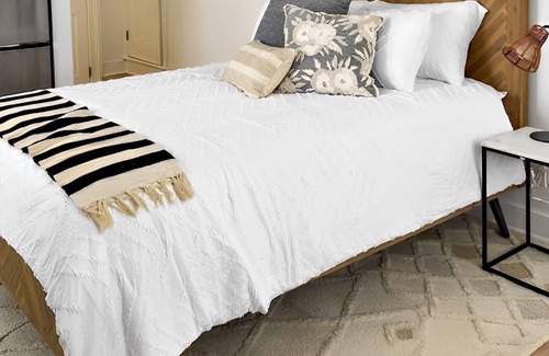 The well appointed queen bed is perfect for relaxing after a day on the town.