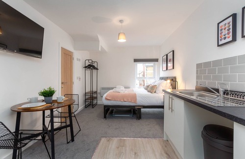 Studio apartment - sleeps up to two guests - in the heart of Blackpool, with double bed, dining table and shower room.