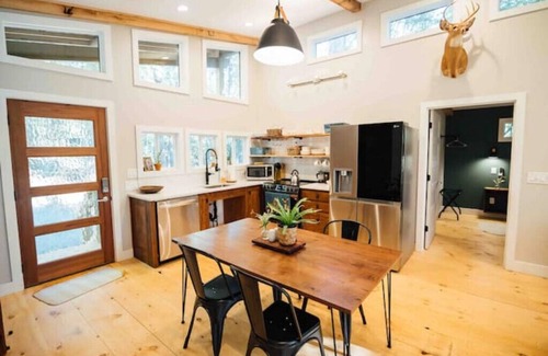 This two-bedroom and two-bath modern cabin sits on 6 wooded acres. The cabin is located at the end of a short paved driveway with easy access and plenty of parking. *There is a ramp for wheelchair/limited mobility access.*