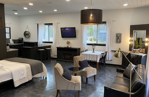 When you spot the lit, rocked pillars from the road, You'll turn into the gravel driveway and head down the oak covered drive. Pulling up to your concrete parking pad, just steps from your private front door, you'll enter Modern Willow Studio. A spacious 680sq. ft. studio set with open concept living room, dining, kitchen, 2-4 person sleeping and beautiful 3/4 bath. Modern Willow is set with large windows on each wall, all facing the beautiful oak woods. With the spacious area to spread out, you'll feel cozy with the electric fireplace at the foot of your comfortable queen bed. A great place to escape the city or relax after a hike on various trails in Morrison County.