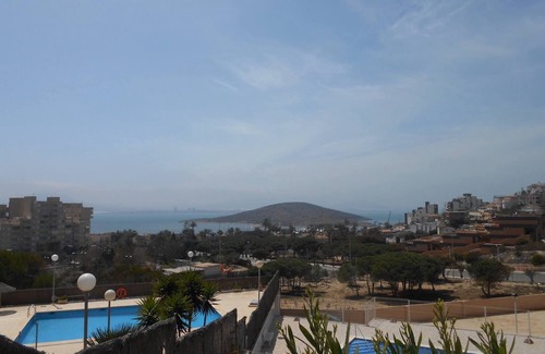 Monte Blanco, La Manga Strip between km 3 & 4. 2 Bedroom apartment Ground Floor, sleeps 5,1 double bedroom, 1 twin, double sofa bed in lounge, hot & cold air con in all rooms, WiFi wheelchair & pram access . The terrace has seating for 5 people and offers stunning views over the Mar Menor. The kitchen is fully fitted includes a washing machine, fridge freezer, microwave and coffee maker. The lounge has a smart TV (some English programs), DVD Player (some English DVD's provided) and CD stereo system. There are 2 communal swimming pools both with separate children’s areas. parking with secure entry. Plaza Bohemia & Zocos shopping both with plentiful bars, restaurants and nightlife are nearby. La Manga Club with its excellent sporting facilities 3 golf courses, tennis courts and football academy is a 10 minute drive. For the non driver there are buses along the strip to Thomas Maestre Marina & Cabo de Palos, also to Cartagena & Murcia. Murcia airport 40 minutes, Alicante 1 hour