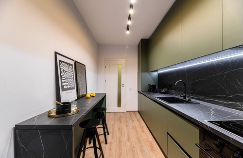 The apartment features a fully-equipped kitchen with a refrigerator and freezer, electric oven, induction stove with 4 burners, Nespresso machine, toaster, and dishwasher. For a much enjoyable experience, we provide a hairdryer, microwave, iron, and washing machine with a built-in dryer. The ambiance is further enhanced by a steam fireplace and remote-controlled lights in each room.