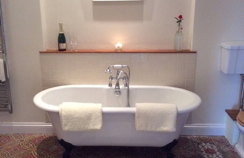 - bathroom with double washbasin, bath, toilet and hairdryer