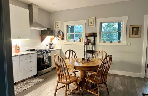 Stay cool and connected with air conditioning, high-speed Wi-Fi, and a 65" cable TV, or unwind and relax by the wood stove on cooler mountain evenings. A futon in the living area adds flexible sleeping space, and the game table is perfect for a quiet round of chess or checkers.