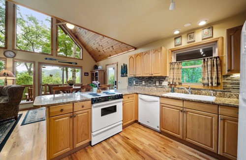 Modern, yet rustic, with a lodge-like feel, family/friends gatherings will be memorable. The primary bedroom boasts a queen-size bed with a SmartTV. There's a full kitchen with updated appliances; refrigerator, stove/oven, microwave, dishwasher, coffee maker.