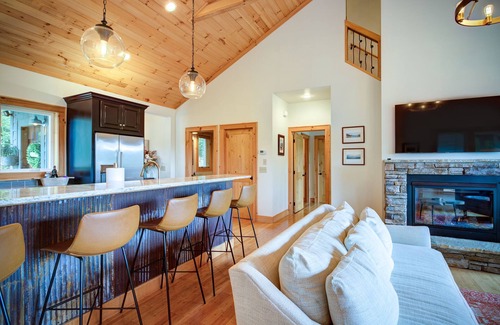 The stunning yellow pine vaulted ceiling will make you want to cozy up in the oversized leather chairs next to the stacked stone, gas log fireplace and smart HDTV. You will be ready to entertain in the fully stocked, gourmet kitchen with two-toned cabinets, natural granite countertop and stainless-steel appliances. The kitchen offers a large, walk in pantry filled with additional cooking appliances and storage space. The barn tin panel accented island sits lined with 5 leather counter stools for additional seating.