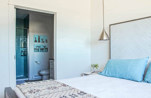 The guest bedroom includes a luxurious queen bed with upholstered head board and ample closet space. The third bedroom includes two twin beds. Guest bath includes tub/shower and all the extra amenities you would expect in a 5-star Airbnb!