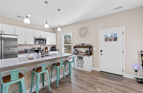 Step into our inviting home, where the entrance sets the stage for a delightful stay. As you cross the threshold, you're greeted by the seamless flow of our open-concept kitchen and dining room, creating a welcoming and communal atmosphere. The fully stocked kitchen awaits, equipped with everything you need for cooking during your stay. Discover the extras, including a fully stocked coffee, tea, and hot cocoa bar, ensuring your favorite beverages are at your fingertips. In the heart of the kitchen, you'll find a stylish island with seating for four, providing an additional space for casual dining or a quick morning coffee. Gather around the modern farmhouse-style table in the dining room, offering seating for 6 and a perfect setting for shared meals and memorable conversations. An arcade system in the dining room adds a playful touch to your dining experience.