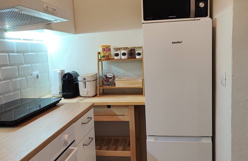 includes a fridge with freezer, induction hob, oven, microwave, Nespresso coffee machine, electric kettle, toaster, blender, all crockery, kitchen utensils, pots and pans, oil and spices, tea/coffee and breakfast.