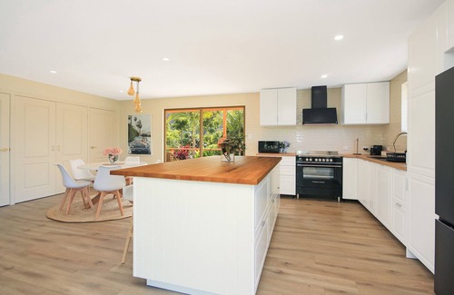 Four well-placed bedrooms are separated from the living area by a hallway, each with luxury linen and high-quality mattresses. The spacious light-filled master bedroom features a plush king bed and large ensuite, air conditioning, plus the bonus of a private entrance onto a deck outside. Further down the hallway are three more bedrooms, one with a single and double bed and one with a queen bed and one with a Double. All have ceiling fans. The main bathroom is opposite these two rooms and has a gorgeous bath and raindrop shower head. Next to the main bathroom is the 4th bedroom or study, which features a comfortable sofa bed that can easily fold out to accommodate an extra two guests. A dryer and a washing machine are also available for your use during your stay.