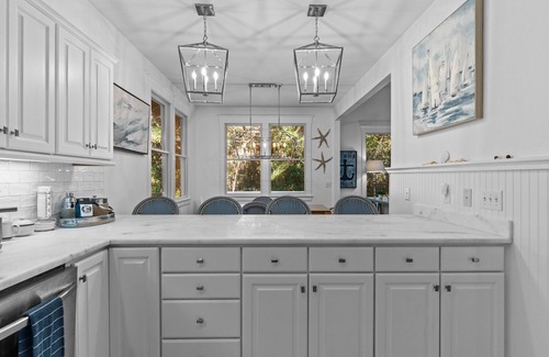 Upstairs, two bright bedrooms await. The first, with two queen beds, and the second with a third queen and a new full bath. This well-appointed property displays decorator touches everywhere-including hardwood floors, wainscoting, plantation shutters, tasteful art and upscale lighting fixtures.