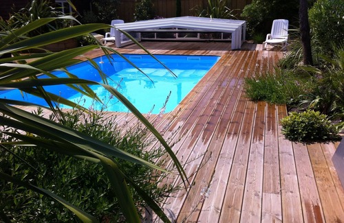 Near SOULAC / MER air-conditioned house of 130 M² in an exotic setting with private swimming pool (6x4) covered (heated to 28 ° from April to November), surrounded by a wooden terrace of 120 M² with Jacuzzi for 5 people, Infrared sauna for 3 people and fitness room with fitness equipment.
