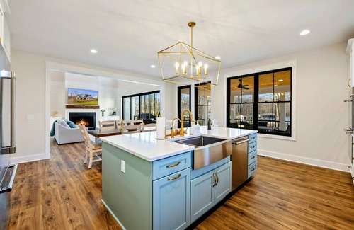 This elegant home has been thoughtfully designed for comfort and style with plenty of space for family and friends. The home easily accommodates large groups with 6 bedrooms and 5.5 bathrooms. Relax in the great room with two story coffered ceilings, a gas fireplace, and large sliding doors that showcase picturesque lake views.