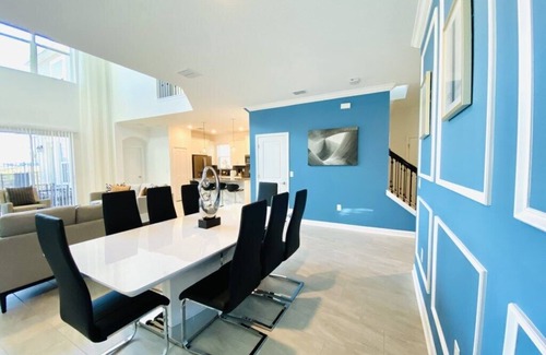 This beautifully decorated cozy home is located in the Champions Gate Resort. There're amazing five bedroom, five full bathroom two story house can comfortably accommodate up to 12 people, features a fully functional kitchen and dining area, a private pool and hot tub to entertain the whole family. It is definitely an excellent choice for your vacation in Orlando!