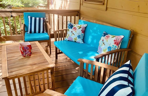 Our cabin is a cozy, light-filled, colorful retreat in the forest where you and your loved ones can relax and rejuvenate while enjoying the beauty (and fun!) of Ellijay. In between river rafting in the summer and apple picking in the fall, we want our guests to return to a functional and beautiful space that is flexible enough to accommodate couples on a romantic getaway, families with children, and friends.