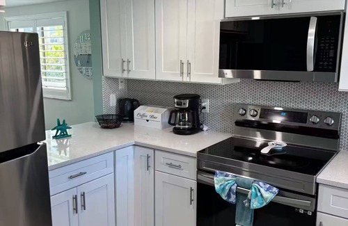 The well-equipped kitchen contains all new stainless-steel appliances, including a refrigerator/freezer, range, dishwasher, microwave, Keurig coffee maker, and quartz countertops.