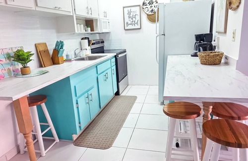 Colorful, fresh & oh-so-turquoise – LagoonBlue 1309 is a studio with soul! Perched on the 3rd floor with the elevator with dreamy ocean & palm views, styled in true Bahamian flair. Thoughtfully designed with everything you need. Balcony bliss for sunny breakfasts or romantic dinners. A unique island gem where turquoise meets your tropical dreams.