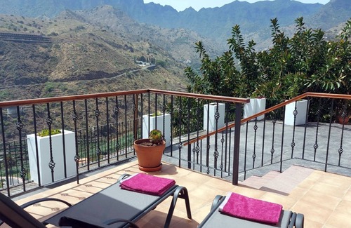 There is a terrace in front of the house, which is partially covered by a wooden pergola. It offers pleasant shade and from the seating area you can enjoy the impressive view of the green valley of Hermigua, the sea and the neighboring island of Tenerife and the Teide summit. We also offer loungers that invite you to sunbathe. The house is in a very quiet location and is an ideal starting point for hiking. It is located on the slope about 1 km from the main road.