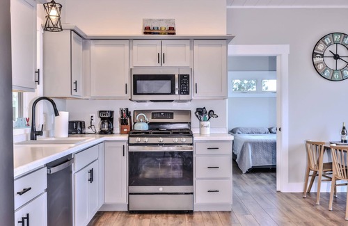 The kitchen has been perfectly appointed for all your needs, making entertaining and dining in a memory instead of a chore. There is a movable island in the cubby area which can be moved into the kitchen for meal preparation and presentation. And then, you can return it to the cubby area for more kitchen floor space (or not).
