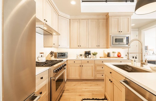 Kitchen: The modern kitchen is equipped with stylish stone countertops, a center island with bar seating, and high-end Viking stainless-steel appliances, including a 6-burner gas range. The fully equipped kitchen also features a drip/Keurig coffee maker and a Breville toaster oven.