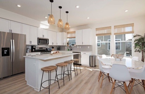 This townhome is ideal for families and friend groups. The waterfront retreat boasts a scenic patio, tastefully decorated living area with high ceilings, and free bikes and kayaks for your personal use.