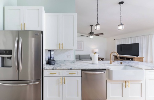 If you are looking for the perfect get away while centrally located book now. "A Wave From It All features an oversized pool with an expansive pool deck for lounging- allow you to lounge poolside without getting splashed by kiddos. The conversational firepit with outdoor lighting will provide the perfect spot for making unforgettable roasting marshmallows over an open flame while telling family stories in the moonlight. If fun in the sun is not your thing, there is even a covered pergola with comfy furniture providing shade for those in the group wanting to be in the mix but out of the sun. When you have had enough of the Florida sun move inside to an open living room with lots of seating and a well stocked kitchen anyone would love to meal prep in. The open kitchen makes it easy for everyone to move around in the morning while trying to get out the door. The home also offers 3 bedrooms- a king bed in the primary bedroom with a workstation for those working remotely- a queen bed with a dresser and spacious closet and the third bedroom has two twins and a dresser. "A Wave From It All" is simply just that...