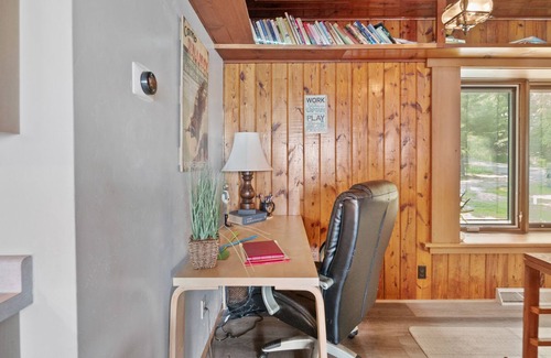 In the summer, spend your days swimming, kayaking, fishing, or simply relaxing on the sandy beach, taking in the serene views. A pontoon boat is available for rent. In winter, you can enjoy the best downhill skiing and tubing in the area at nearby Nordic Mountain. You can also go ice fishing, snowshoeing, cross-country skiing, or take advantage of snow mobile trails.