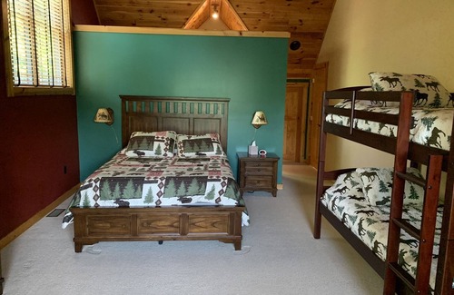 Lodge has 2 large bedrooms upstairs each with a queen bed and bunk bed and private bathroom with shower. Open loft with sitting area between the bedrooms. Main floor has spacious master bedroom with large open shower and relaxing soaking tub. Master also opens to a screened in porch with outdoor dining table. Main living area with soaring ceilings, large windows and open concept kitchen, living, dining room which surrounds wood stove stocked with firewood. Mud room/laundry and half bath off main living area. Downstairs has separate “in-law” space with sitting area, television, small kitchen with sink, refrigerator and microwave. Separate bathroom with shower and a fourth bedroom off this area with queen bed. Plenty of room to spread out and have your own space. Well behaved pets welcome !