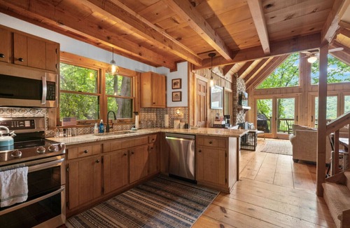This unique Plummer's Cabin has been recently renovated and provides a rustic feeling that is encompassed by lush green surroundings. This cabin is perfect for a family or friends get away retreat. The kitchen has new appliances and granite counters. The large wrap around decks provide amazing views of the mountains and the lower deck has the Trex Gutter system above so you can enjoy sitting outside when it is raining! This cabin provides a tranquil setting with a gas fire pit outside including a gas grill. The home has 3 bedrooms and the couch in the living room converts to a queen bed.