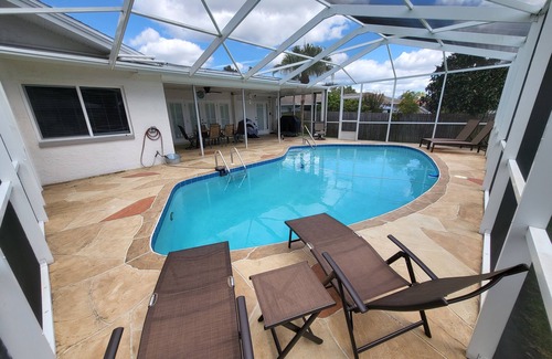 Brand new fully equipped kitchen with appliances such as a Ninja blender, toaster oven, air fryer, coffee maker, dish washer and much more. Kitchen table has seating for 6 as well as 4 bar stools at the counter. French doors from in the kitchen that go out to the pool area. Full size washer and dryer in the laundry room. Enough room for 10 people to sleep comfortably. The master bedroom has a queen size bed with en suite bathroom that has a door out to the pool area. The second bedroom has a twin over full bunk bed with a trundle twin bed perfect for the kids. The 3rd and 4th bedrooms have queen beds. We also have a pack and play with a 1.5 inch organic cotton mattress. Newly remodeled bathroom between 3rd and 4th bedrooms with a tub and a shower. Bath and beach towels available as well as everything you will need for a day at the beach. There are beach chairs, a beach umbrella, coolers, etc. Smart TVs in all rooms and free WiFi access. Large living room with large TV and french doors out to the pool area. We have a beautiful screened in pool area with a grill perfect for dinners outside. Heated pool. (There will be an extra charge of $30 per day to heat the pool if needed.) Just minutes from plenty of restaurants, grocery stores, and a shopping mall. Located in a quiet residential neighborhood. Only 11 miles from famous Clearwater Beach and Pier 60, 7 miles to the Dunedin Causeway, 21 miles to Busch Gardens in Tampa, and under 100 miles from Sea World and Disney World in Orlando. Conveniently located 16 miles from Tampa International Airport (TPA) and 10 miles from Clearwater-St. Pete Airport (PIE.)