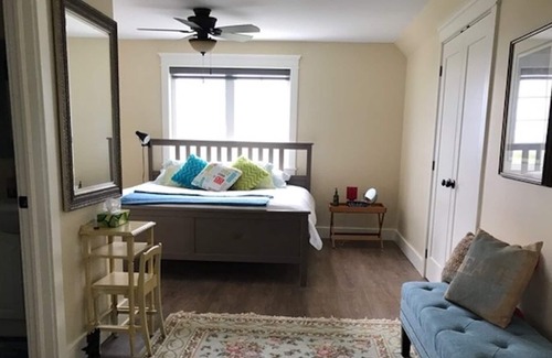 Inside, the cottage features two bedrooms on the main floor and one in the loft, each furnished with a comfortable king-size bed and ceiling fans for added comfort. The three full bathrooms, two downstairs and one upstairs, are well-appointed with hair dryers, towels, and washcloths provided.
