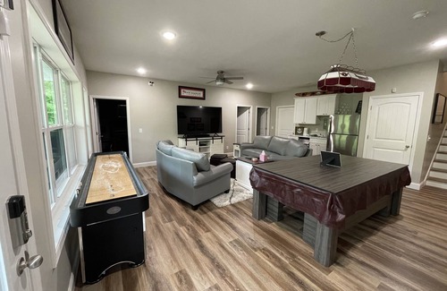 The rec room level has another 65 inch large screen TV and a bar kitchen with commercial ice maker and 3rd refrigerator. There is a pool table, ping pong table, and shuffle board. Guests have access to a gaming system, satellite TV, and high speed internet. 3-4 guests have worked remotely at one time without internet issues.