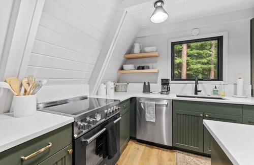 Fully renovated in 2024, the use of space is absolutely perfect – whether you are grillin' and chillin' on the oversized deck, with table/chairs for 8 people, or having a picnic on the generous grassy yard listening to the Aspens, you can't beat it. Known as the “walking street” this neighborhood is a quiet established area, only interrupted by the sounds of the river and nature right outside your front door (you will see plenty of deer). With heavy forest on 2 sides, and conveniently located near EVERYTHING, The River Cabin A-Frame has so much to offer. You'll never want to leave!