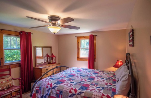 The farmhouse sleeps up to six people, with 3 bedrooms offering a comfortable King-size bed in one, Queen in another, and a full in the third. Quilts on the bed bring you back in time. In true vintage cottage living, they share a bathroom. Wood floors throughout the farmhouse add to the charm, and you'll enjoy the sounds of the rain on the metal roof.