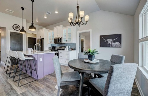 Enjoy a delightful stay in our 5-Star Rated Modern and Stylish Bungalow! Our home is equipped with 3 bedrooms, 2 bathrooms, and much more to make your stay comfortable. The master bedroom has a king-sized, super comfy bed, with the second bedroom is equipped with two twin beds, which can be combined to provide a king-sized bed. The third bedroom is set up as a dedicated office, but slide the desk away, and there is a queen-sized wall bed that provides sleeping for 2 more guests. High speed internet, two smart TVs, a full laundry room, and one garage space provide amenities to help you feel right at home. The kitchen is fully equipped with lots of pots, pans, coffee maker, other amll appliances, and plenty of dishes to serve up a great meal. In the morning, sunshine streams through the back windows to welcome the day. A spacious back yard with covered patio is a quiet respite from the day's activities, and a charming gas fireplace keeps you warm at night. Our house is in a great and quiet location for you to discover both Edmond and Oklahoma City. We're within driving distance to restaurants, bars, and shops. Our home is immaculate, and we don't think you will want to leave. We look forward to hosting you! ps. Ask us about long-term rental deals!