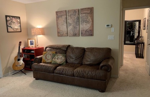 Property is on the second and third floors of a three story townhouse. Main front entrance leads to open space Kitchen, Dining and Living area and a balcony with comfortable seating watching a pond. On the third floor are the two Master Suits, each with adjacent full bath. Bedrooms are each with Queens size beds, the one is convertible sofa with extra padding mattress. Laundry Room is on the same floor. Next to the subdivision is a trail, miles long, perfect for walking/jogging/biking. On a walking distance is downtown Winter Springs with large grocery store, small restaurants some with live music, service areas, Starbucks, McDonalds, Wedndy's, Subway and other small restaurants. Couple of parks are around, one with BBQ pits, large sport fields, pond into the big lake Jesup's for fishing. Ocean fishing is on 45 min drive, closest is New Smyrna Beach, large beach and small art stores and galleries. Disney area and the other parks are also on 45 min drive on South.