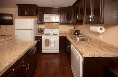 The studio unit contains a completely stocked kitchen (gas range/oven, dishwasher, microwave, full-size refrigerator, large stainless steel sink with garbage disposal) wood laminate floors, custom wood cabinetry, granite counter tops with eat in island, flat screen TV with premium cable and high speed internet/WiFi, 3 piece bathroom with ceramic flooring, recessed lighting, wood blinds, in wall heater and ceiling fan. There is also plenty of storage with 2 extra-large, stand-alone, mirrored-door wardrobes as well as an extra closet off the kitchen. We even have a separate, dedicated washer & dryer for studio guests (a rare convenience for any studio/nanny quarters)!