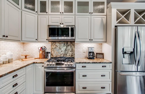 The open kitchen is stylish and refined, offering stainless steel appliances (including a French-door refrigerator, a gas range, and a dishwasher), a large center island with bar seats for six, and even a garbage disposal. The adjacent dining room table seats six as well.