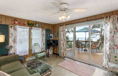 One bedroom one bath sleeps three adults or two adults and two children. Adorable honeymooners bungalow includes queen bed and a sleeper sofa. Cottage includes fully equipped kitchenette, TV/DVD, and lake view deck with grill and outdoor dining set. This cottage is the smallest of the three but offers the best deck for entertaining and stunning lake views. This cabin has a window air conditioner in the front room and ceiling fans.