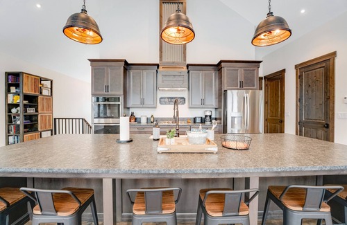 Amidst vaulted ceilings and ample natural lighting, the open-concept layout promotes effortless family time. Get cozy on the oversized leather sofa as the chef of the group utilizes the kitchen's farmhouse sink, dual ovens, and expansive meal prep space. When it's time to eat, gather together at the sizable breakfast bar or the wooden dining table.