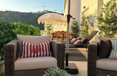 Imagine entering a peaceful sanctuary in the mountains with easy access to a a beach, supermarket, mall, old town Marbella all 5-10 min drive. There is a dedicated parking space, access to community gym and pool with 24/7 security. The apartment is a "new build" and has been recently decorated to a high standard. The master bedroom has built in USB Chargers with bedside tables, chest of drawers, ensuite bathroom. Once you open the shutters the bedroom expands into an outdoor sitting area overlooking the Mediterranean sea. 2 more bedrooms downstairs with all the luxuries for urban professionals including a high speed WiFi and a fully functional home office. Its easy to work from your new sanctuary whilst enjoying the sun, sea and alfresco dining overlooking the lush green mountains. All rooms are equipped with shutters to keep the sun out for a perfect night's sleep or a daytime siesta. A fully equipped kitchen with microwave, oven, hob, fridge/freezer, washing machine, pantry, all essential utensils and tableware. Property is 35mins drive from Malaga Airport and 10min drive from buzzing restaurant district of old town Marbella.