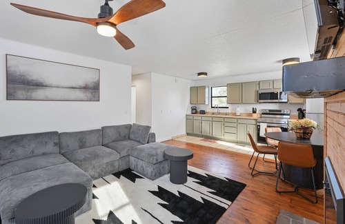 Escape to this charming 2-bedroom mountain retreat cabin. One room has 2 bunk beds that can comfortably sleep 4 people. Unwind in the luxurious king-size bed or relax on the couch in the living room. Enjoy the convenience of a fully equipped kitchen for your culinary adventures and relax on the spacious deck overlooking the mountains after a day of exploration.