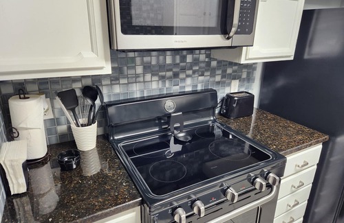 including a toaster, crock pot, mixer, blender, electric grill etc. Fully equipped bathrooms. There are board games to play also if you feel like staying in by the electric fireplace.
