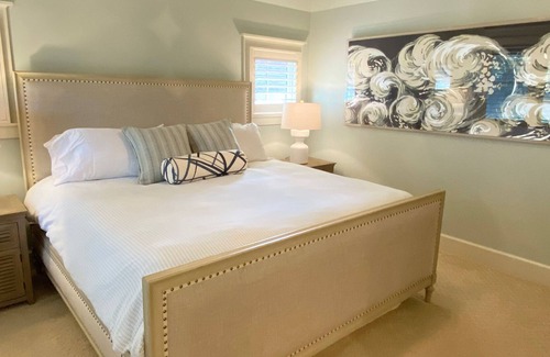 Upstairs, two bright bedrooms await. The first, with two Twins, provides two closets, a desk and utilizes the ample full bath just across the hall. The substantial Primary King also proffers a desk area as well as a sizable Primary Bath with a marble his-and-her vanity, an oversize walk-in closet, a very large shower and a separate water closet. The third bedroom, located in the home's crofter, not only grants plenty of privacy but presents a lovely Queen suite with a mini-fridge and full bath. This well-appointed property displays decorator touches everywhere-including hardwoods throughout, wainscoting, plantation shutters, tasteful art and upscale lighting fixtures.