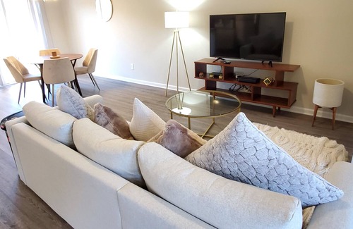 Each townhouse features modern and chic furniture, Roku and Spectrum TV, essential cookware for light meals, dinnerware, and utensils, Keurig coffee machine, in home washer and dryer, iron and board, and (2) hair dryers.