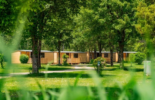 The "Wood Cube" mobile home features an exit leading to a roofed terrace measuring 9 square meters, complete with outdoor furniture for your enjoyment. From the terrace, you can appreciate picturesque views of the surrounding mountains and countryside. Internet access is provided via free WiFi, ensuring connectivity during your stay. Please note that this is a non-smoking accommodation. Additionally, a private mooring area is available at an extra cost.